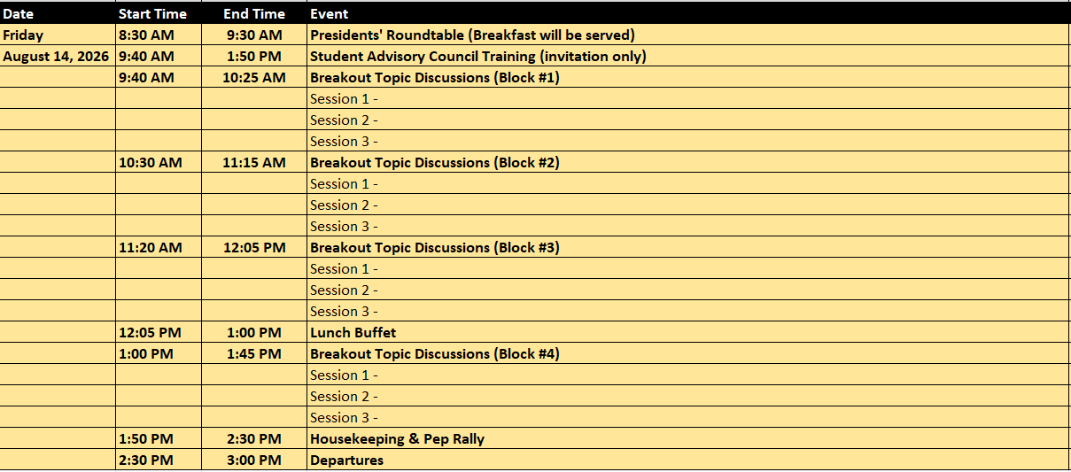 August 13-14, 2026 Hyatt Regency - Columbus, OH The kickoff to the academic year convening a group of student leaders.